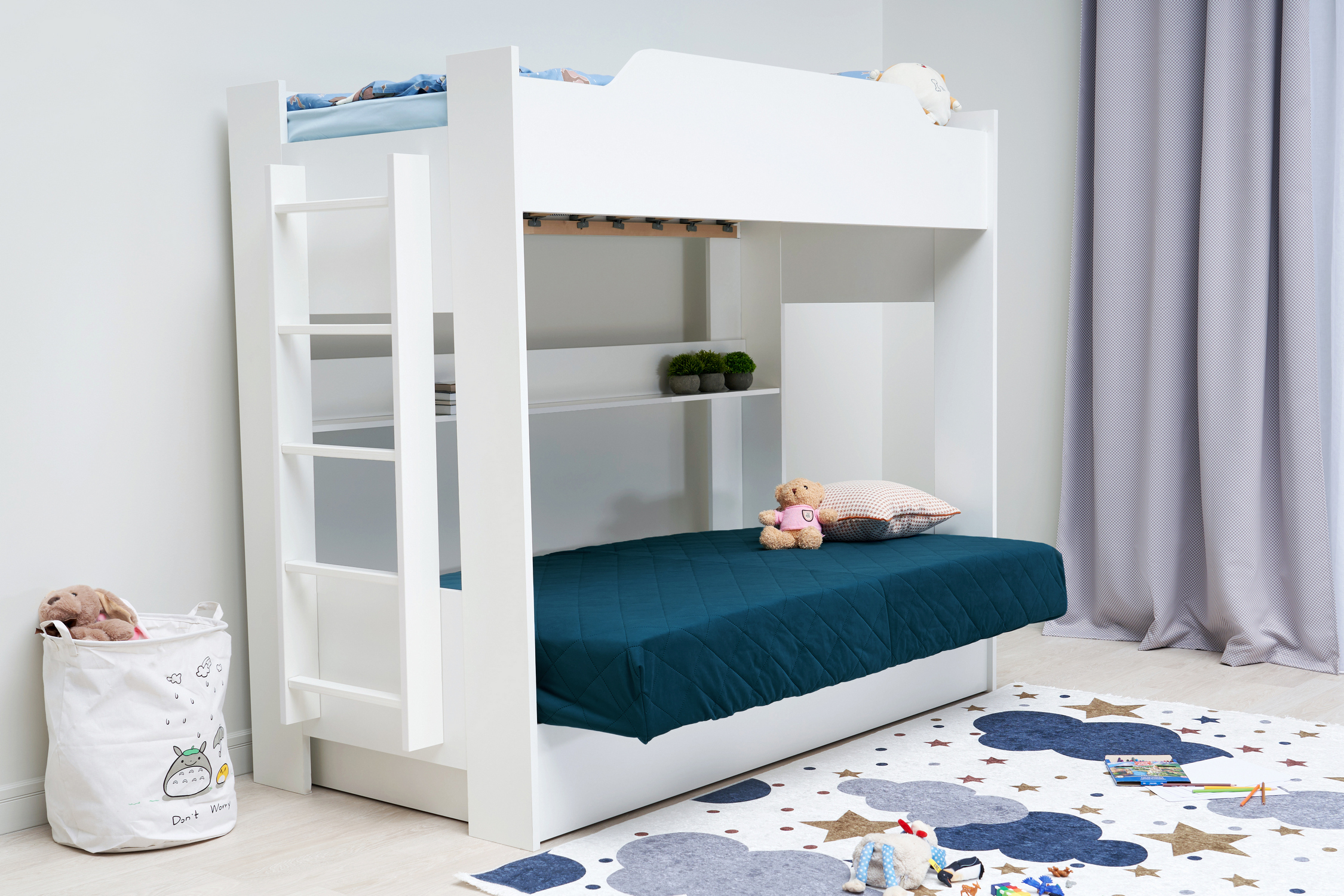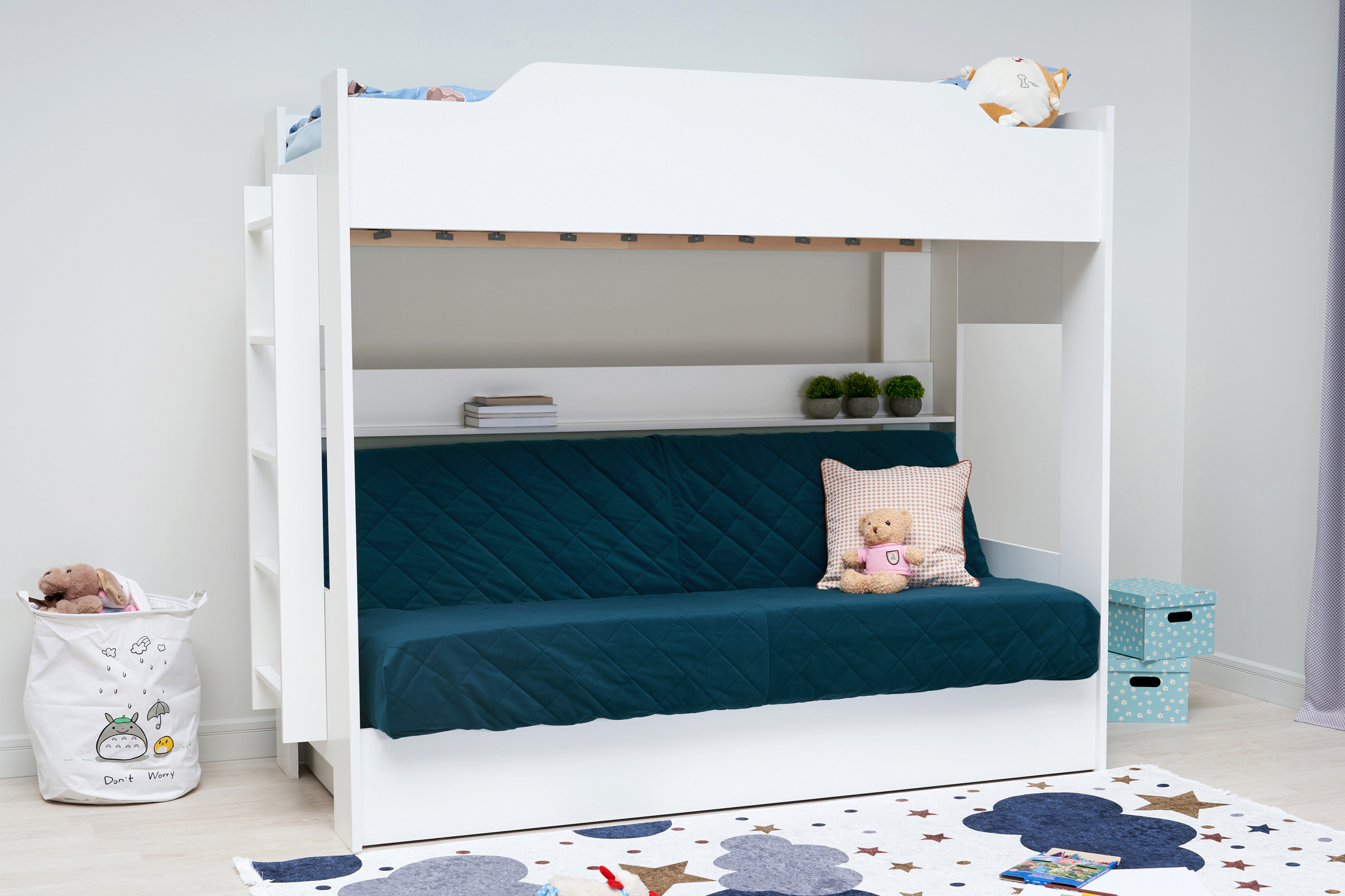 Механизм трансформации дивана: «Книжка». Рекомендуемая высота матраса на верхний ярус 17 см. Максимальная нагрузка на верхний ярус 50 кг. Лестница может быть установлена с обеих сторон кровати. Высота бортика 30 см. Максимальная нагрузка на нижний ярус 90 кг. Чехол съемный.